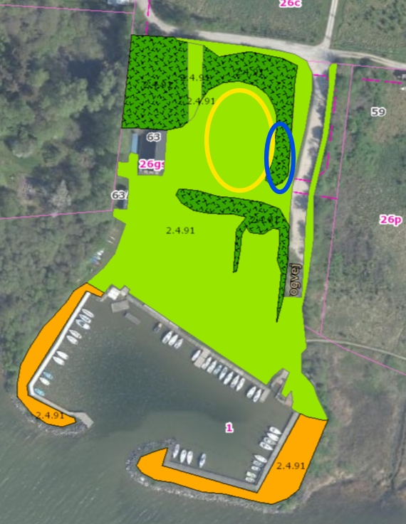 Billede 2, blå markering. - Græs og brombær bag bådene på vinterpladsen vil blive beskåret 2 gange i år.